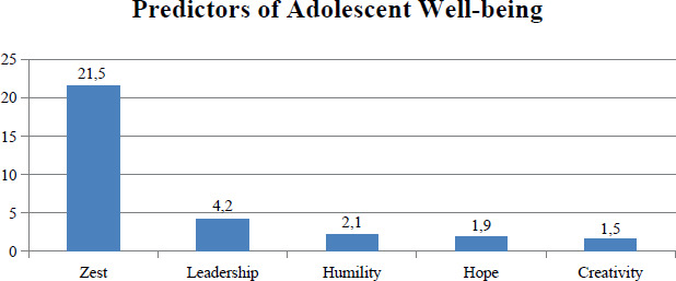 The findings of the study indicate a significant correlation between character strengths and well-being, with certain prominent strengths emerging as predictors of adolescent well-being. The present study found that zest, leadership, and hope were positive predictors of adolescent well-being. Conversely, humility and creativity were found to be negative predictors.