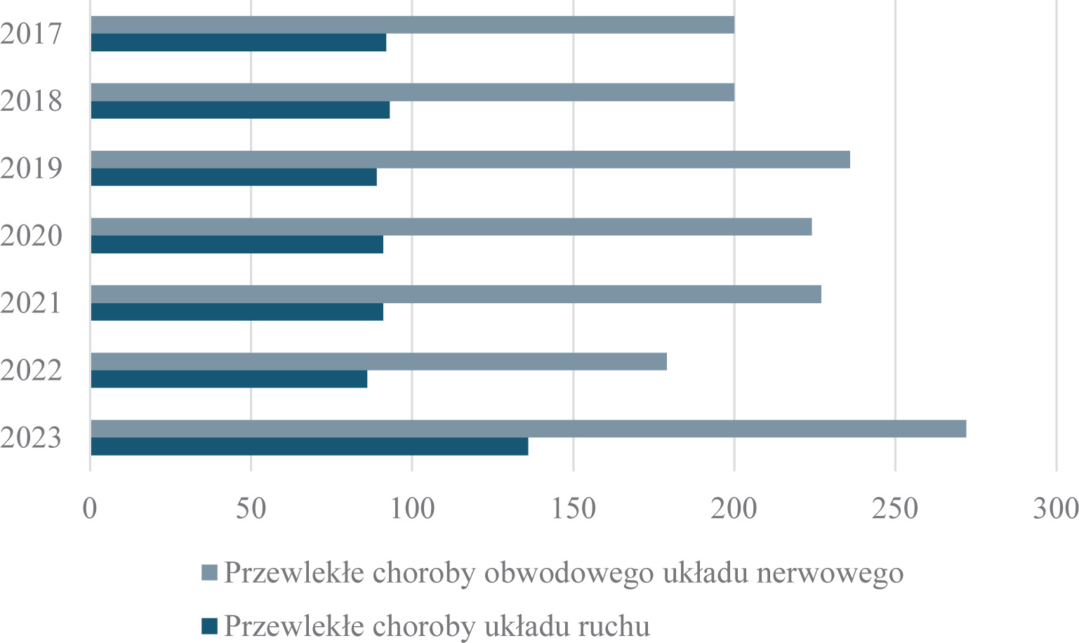 Absencja pracownicza może być powodowana nieodpowiednimi warunkami pracy, w tym oddziaływaniu czynników niebezpiecznych i szkodliwych dla zdrowia i życia osób przebywających w takim środowisku. Jest także spowodowana sposobem wykonywania pracy prowadzące do m.in.: przewlekłych chorób układu ruchu, chorób obwodowego układu nerwowego – zespół cieśni w obrębie nadgarstka, zespół kanału de Guyona. W 2023 r. stwierdzono w Polsce 3002 przypadki choroby zawodowej. Przewlekłe choroby obwodowego układu nerwowego stwierdzono u 272 osób (9,1% wszystkich przypadków chorób zawodowych). W 264 przypadkach był to zespół cieśni w obrębie nadgarstka, stanowiący 97,1% tej grupy. Przewlekłe choroby układu ruchu z liczbą 136 przypadków znalazły się na piątym miejscu, stanowiąc 4,5% ogólnej liczby chorób zawodowych (Świątkowska, Hanke, 2024). Dane przedstawiono na rycinie 3.