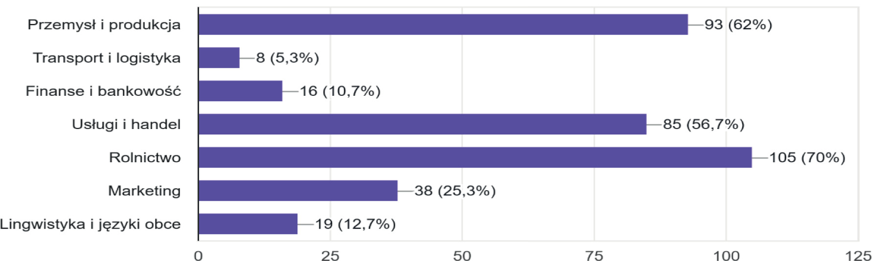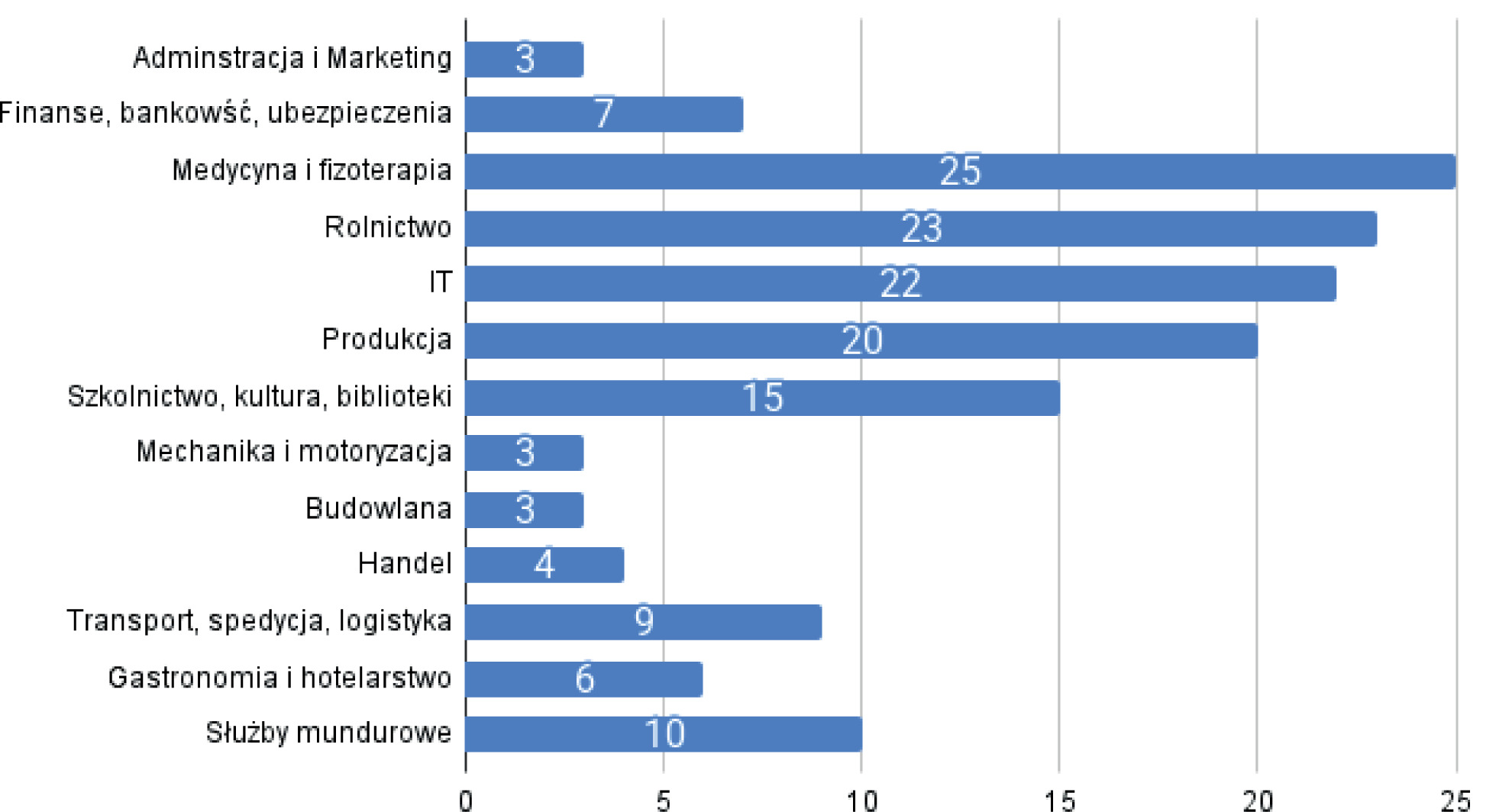 Badanie charakteryzuje się zróżnicowanym przekrojem branżowym, jednak dominują w nim respondenci z sektorów takich jak medycyna i fizjoterapia (25 respondentów), rolnictwo (23 re- spondentów), IT (22 respondentów) oraz produkcja (20 respondentów). Wśród najmniej licznej grupy ankietowanych znajdują się osoby pochodzące z sektora mechanizacji i motoryzacji, branży budowlanej oraz handlu. Rozkład podanej cechy obrazuje rycina 1.
