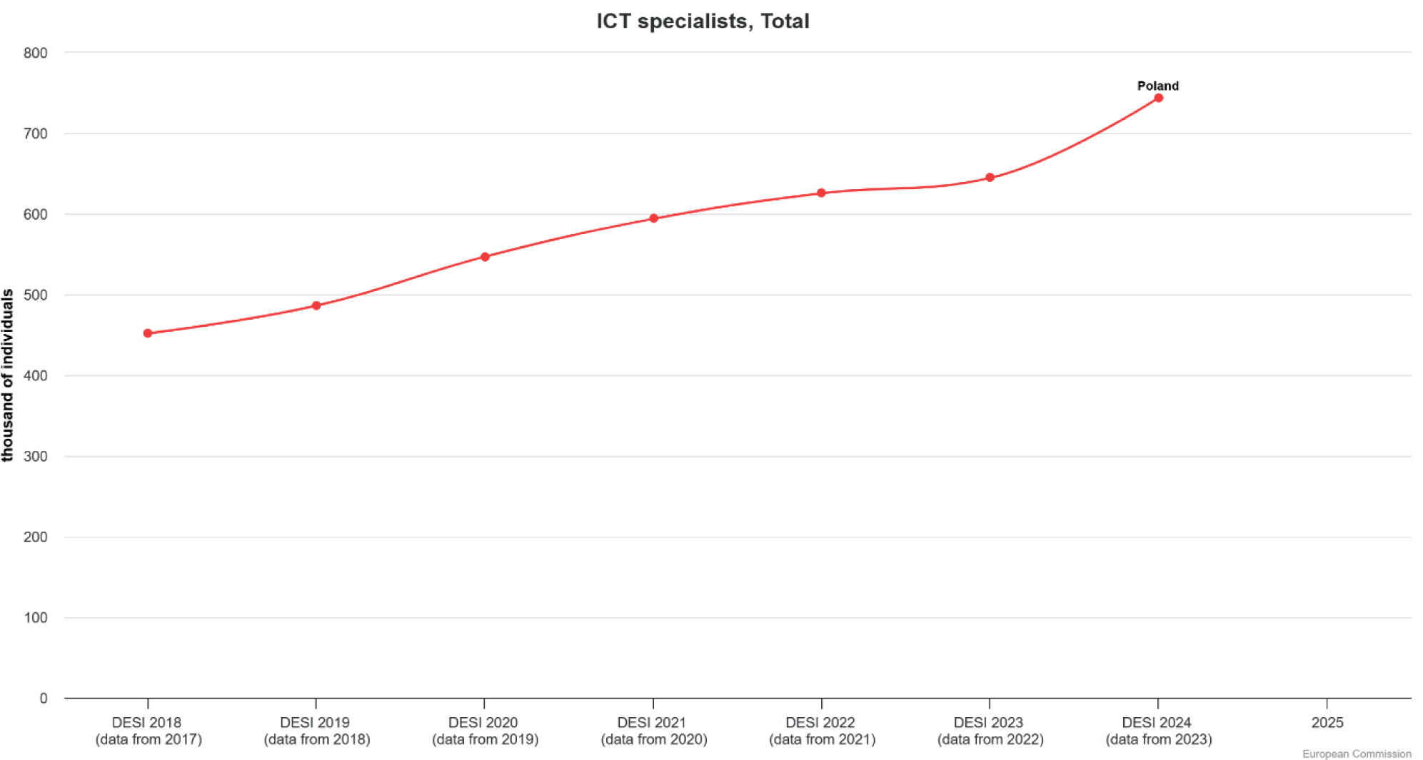 Źródło: European Commission. (2025b). Indeks Gospodarki Cyfrowej i Społeczeństwa Cyfrowego (DESI). Pobrane z: https://digital-decade-desi.digital-strategy.ec.europa.eu/datasets/desi/charts/compare-countries-progress?indicator=desi_ict_spec&break-down=total&unit=th_ind&country=PL (data dostępu: 15.05.2025).