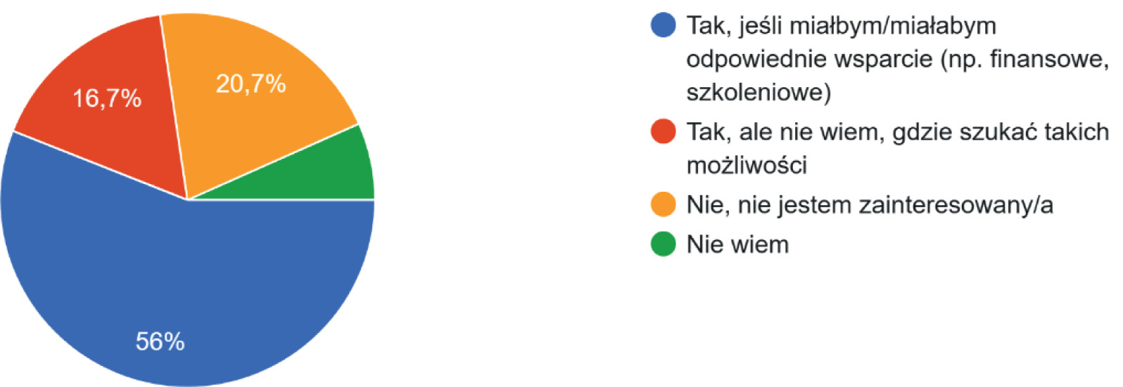 Kluczowym pozytywnym wynikiem jest także wysoka gotowość pracowników do adaptacji w razie trudnej sytuacji na rynku pracy – prawie 3/4 ankietowanych zadeklarowało skłonność do przekwalifikowania się (rycina 12). W kontekście rosnących nierówności gotowość ta jest warun- kowana przede wszystkim odpowiednim wsparciem ze strony pracodawców i instytucji publicz- nych. Jest to silny sygnał świadczący o proaktywnej postawie pracowników oraz o ich wysokiej świadomości konieczności inwestowania we własny kapitał ludzki.